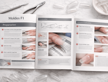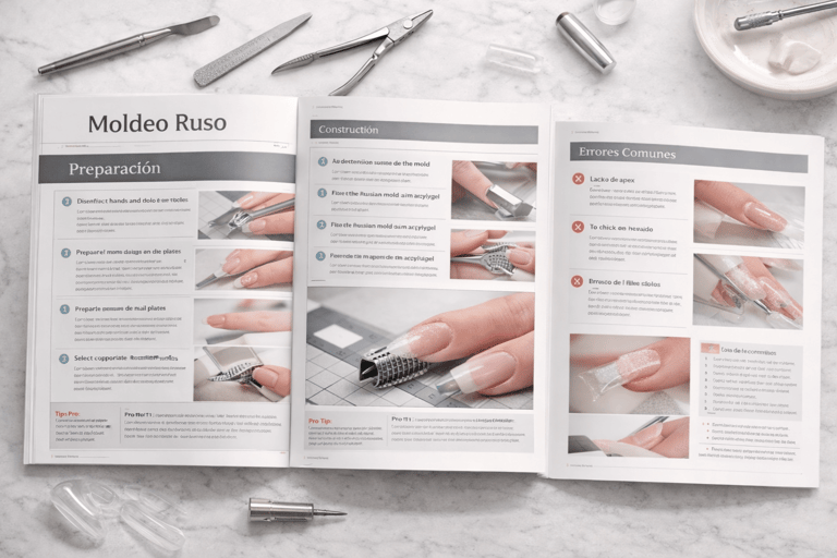 Manual enfocado en la técnica de molde ruso, explicando alineación, adaptación y construcción de la uña con mayor control y simetría.
