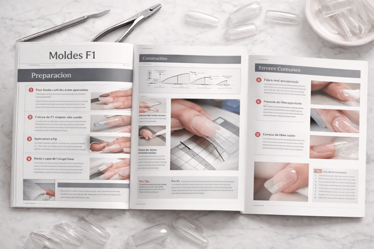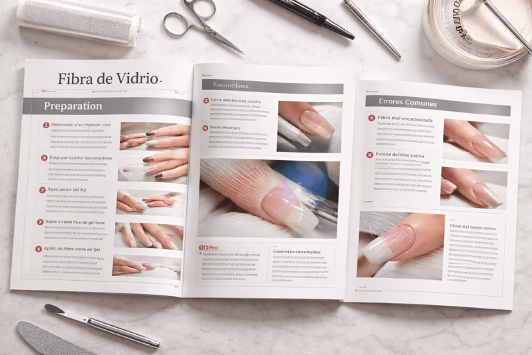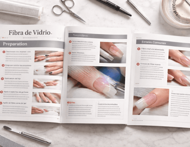 Manual técnico con el paso a paso de la aplicación de fibra de vidrio, desde la preparación de la uña natural hasta el acabado final, con enfoque didáctico y profesional.