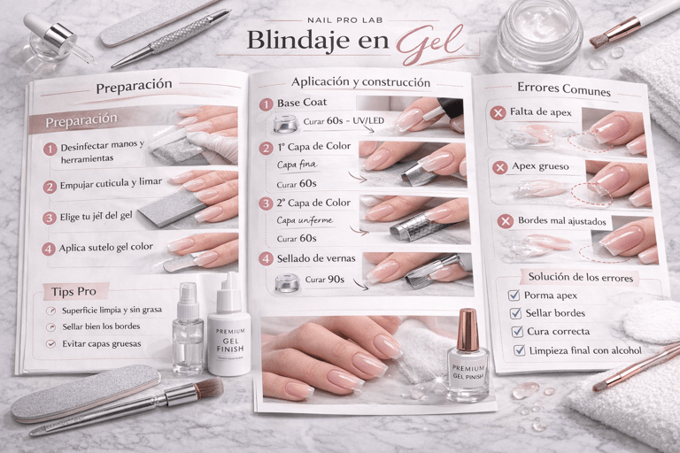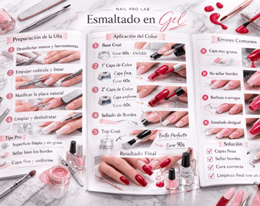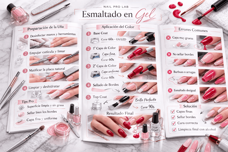 Manual paso a paso del esmaltado en gel, con enfoque en preparación, aplicación uniforme, curado y acabado profesional.