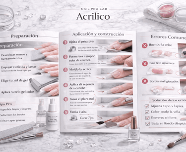 Manual profesional de acrílico, abordando preparación, control de la perla, construcción, estructura y finalización del trabajo.