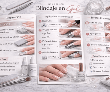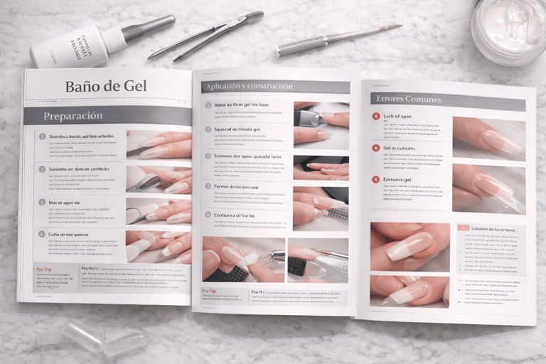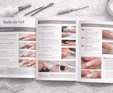 Material enfocado en la técnica de baño de gel, ideal para reforzar la uña natural, con explicaciones claras sobre aplicación y sellado.